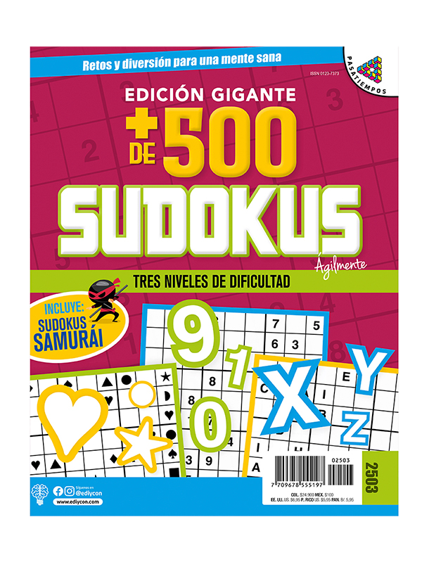 Revista agrandada de Sudokus, 288 páginas con más de 500 sudokus en tres niveles de dificultad: fácil, medio y experto. Tapa fina y papel interior de más calidad.